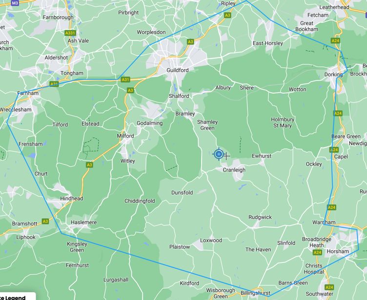 Albury, Alfold, Baynards, Blackheath, Birtley Green, Bramley, Broadbridge Heath, Bucks Green, Burpham, Busbridge, Chiddingfold, Chilworth, Clemsfold, Cranleigh, Dunsfold, Dorking, East Horsley, Ellens Green, Elsead, Ewhurst, Farley Green, Farncombe, Farnham, Forest Green, Godalming, Gomshall, Guildford, Haslemere,Hindhead, Ilfold, Kirdford, Loxwood, Merrow, Milford, Normandy, Peaslake, Plaistow, Rowly, Rudgwick, Shalford, Shamley Green, Shere, Slinfold, Tismans Common, Walliswood, West Horsley, Westcott, West Humble, Winterfold, Wintershall, Wisborough Green, Witney, Wonersh.